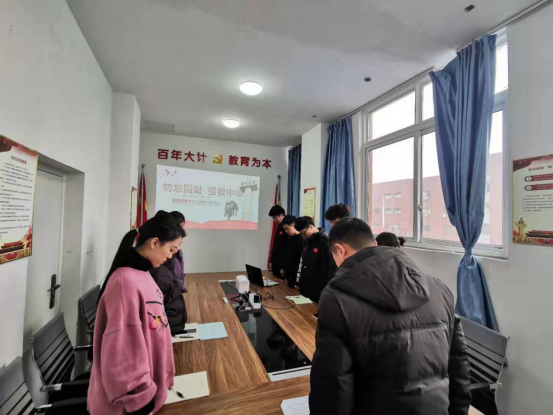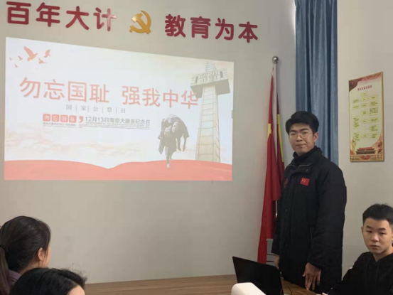 12月13日上午在艺术体育部党总支第二支部书记王勇老师的带领下,学生党员与部分积极分子在党员活动室举行了“勿忘国耻 强我中华”主题教育活动。共同缅怀在南京大屠杀中遇难的同胞,缅怀为中国人民抗日战争胜利牺牲的革命先烈和民族英雄。