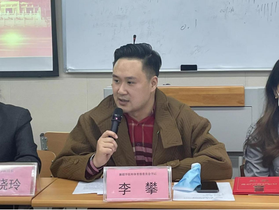 舞蹈学院和体育部委员会书记李攀首先宣布了学校委员会2021-2022年度关于党务先进的表彰情况:舞蹈学院获得“先进基层”荣誉称号,李立婧同志获得“优秀党务工作者”荣誉称号,蒋嘉陵、王付浩同志获得“优秀共产党员”荣誉称号,李攀书记向他们表示祝贺;他还对学校、学院相关党务组织的更名及人事任命情况作了说明;然后他传达了党的二十大精神,并要求将二十大精神全面覆盖至各位教师、学生;最后,李攀书记强调了疫情防控的重要性。