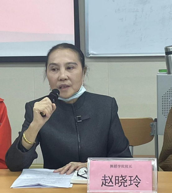 舞蹈学院院长赵晓玲首先鼓励各位教师积极向党组织靠拢;然后她对于上周召开的学生座谈会中收集的意见和建议作了总结,并逐一反馈给各位教师,敦促其有针对性地调整教学方案;赵晓玲院长还对论文抽检、专家入库申请、教材撰写、行课规范、学生缓考、舞剧排练、体能测试等事项进行具体说明和安排。