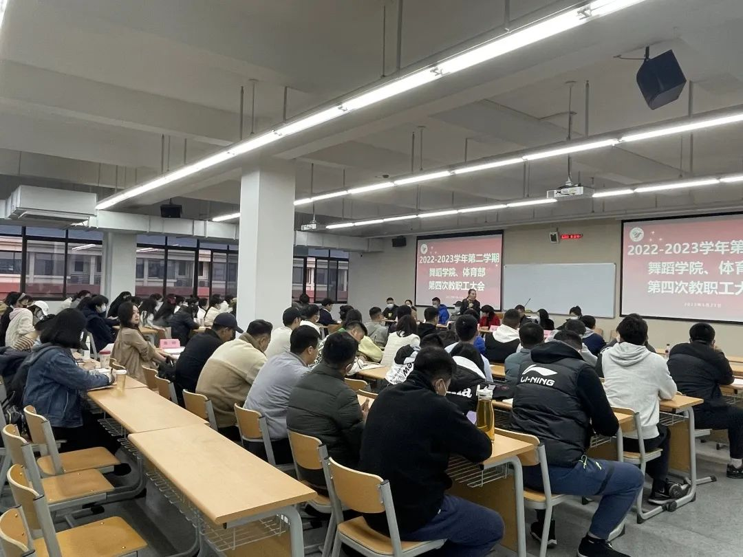 2023年3月23日18:30,舞蹈学院、体育部在西区2A07-401教室召开本学期第四次全体教职工大会,舞蹈学院院长赵晓玲、舞蹈学院党委书记宋玉、舞蹈学院艺术总监范和平、舞蹈学院副院长蒋嘉陵、舞蹈学院副院长张伟、舞蹈学院副院长李立婧、舞蹈学院副院长程瑾、舞蹈学院和体育部委员会副书记、体育部副主任陈朝晖、舞蹈学院和体育部委员会副书记杨用及全体教职工参加此次会议。会议由赵晓玲主持。