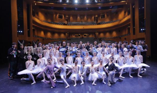 8名学生与芭蕾舞剧《天鹅湖》演员合影