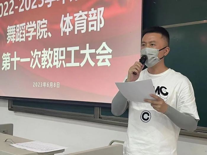 2023年6月8日18:30,舞蹈学院、体育部在东区A01-106教室召开本学期第十一次全体教职工大会,舞蹈学院院长赵晓玲、舞蹈学院党委书记宋玉、舞蹈学院艺术总监范和平、舞蹈学院副院长蒋嘉陵、舞蹈学院副院长张伟、舞蹈学院副院长李立婧、舞蹈学院副院长程瑾、舞蹈学院和体育部委员会副书记、体育部副主任陈朝晖、舞蹈学院和体育部委员会副书记杨用及全体教职工参加此次会议。会议由赵晓玲主持。