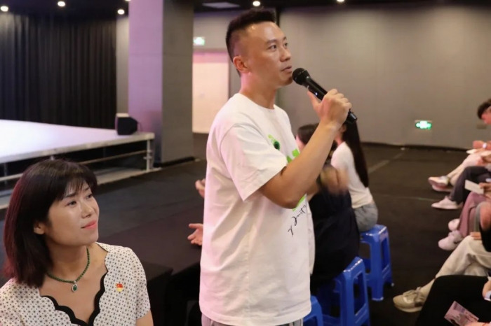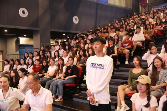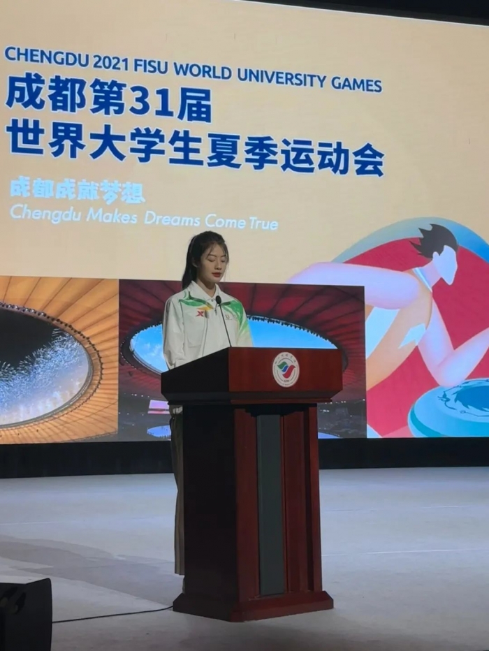 老生代表施又慈、熊笑坪同学分别介绍了自己在大学生活中参加大运会志愿者期间的所感所想,以及对于未来的美好期望、对23级新生的鼓励与期待。