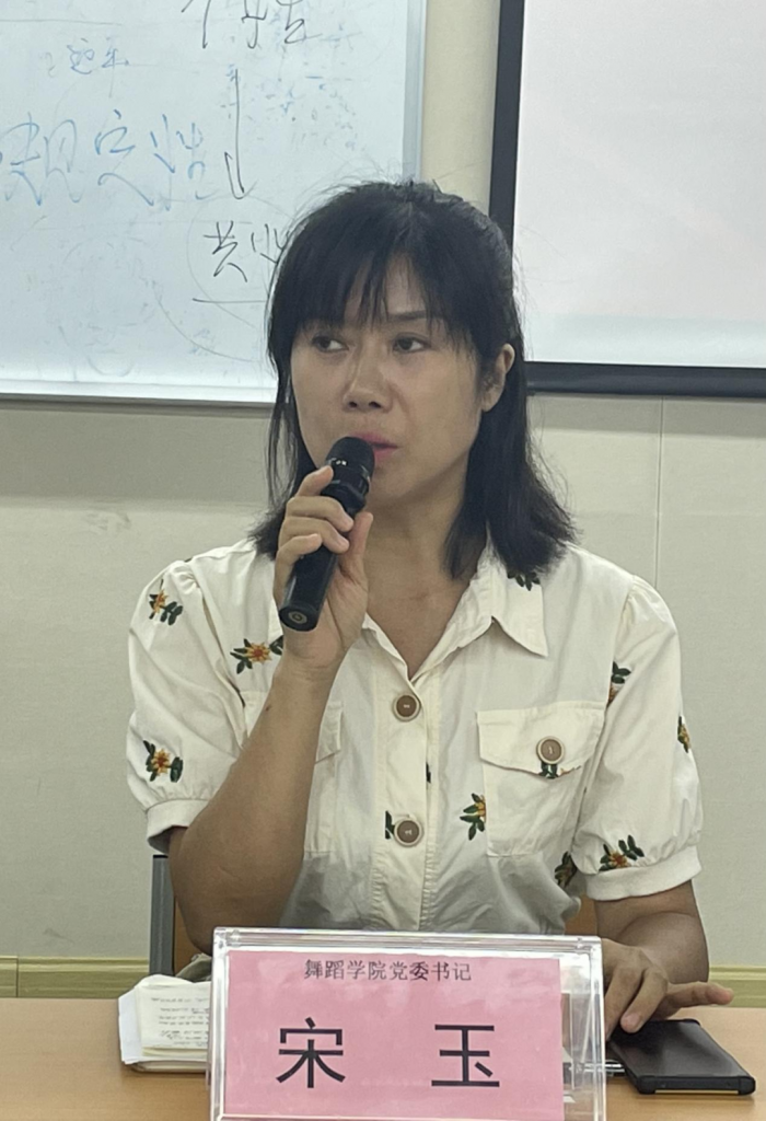 宋玉书记首先对舞蹈学院、体育部全体教师进行师风师德教育,她表示,教师应对自己“高标准、严要求”,为学生树立做人标准,带给学生榜样的力量,践行思想高尚、服务育人;她还针对两个部门的工会入会率达到100%的情况进行了通报;宋玉书记对会风会纪、学生外出的安全交接、就业率的促进手段等进行了重点说明。