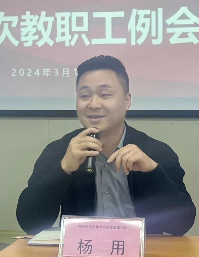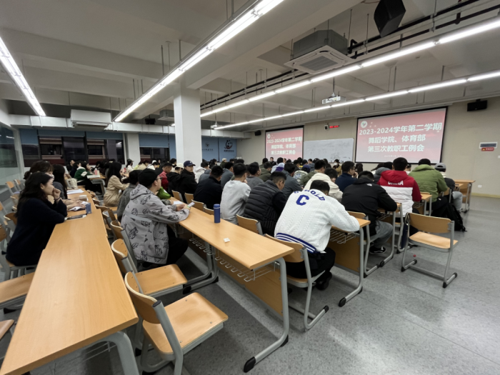2024年3月14日18:30,舞蹈学院、体育部在西区A07-401召开2023-2024学年第二学期第三次全体教职工例会,舞蹈学院院长赵晓玲、舞蹈学院艺术总监范和平、舞蹈学院和体育部分党委书记宋玉、舞蹈学院副院长蒋嘉陵、舞蹈学院副院长李立婧、舞蹈学院副院长程瑾、舞蹈学院和体育部委员会副书记、体育部副主任陈朝晖、舞蹈学院和体育部分党委副书记杨用及全体教职工参加此次会议。会议由赵晓玲主持。