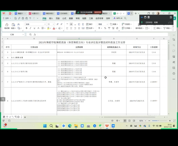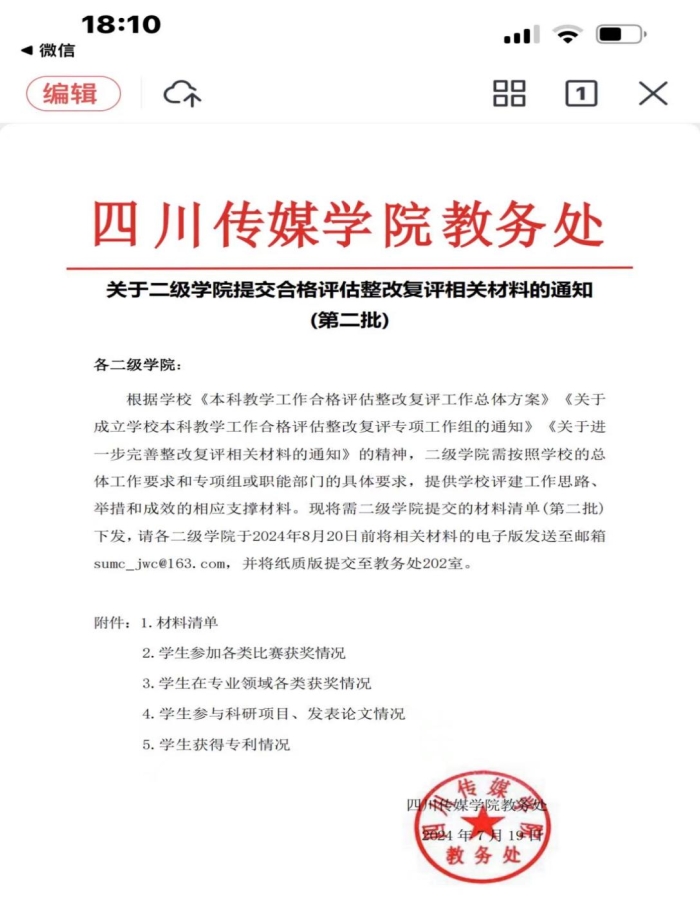 首先由程瑾副院长对上一阶段整理教学评估材料专家检查意见的归纳总结,其次对“关于二级学院提交合格评估整改复评相关材料的通知”进行解读何部署。着重强调四川传媒学院学生在专业领域各类获奖情况的收集整理,主要负责人为金鑫老师,其他各部老师配合金老师收集汇总,工作安排如下: