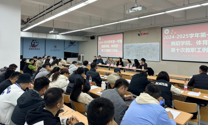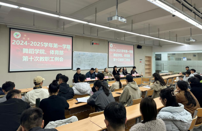 2024年11月21日18:30,舞蹈学院、体育部在西区2A07-401召开2024-2025学年第一学期第十次全体教职工例会,舞蹈学院院长赵晓玲、舞蹈学院和体育部分党委书记宋玉、舞蹈学院艺术总监范和平、舞蹈学院副院长蒋嘉陵、舞蹈学院副院长李立婧、舞蹈学院副院长程瑾、舞蹈学院和体育部分党委副书记、体育部副主任陈朝晖、舞蹈学院和体育部分党委副书记杨用及全体教职工参加此次会议。会议由赵晓玲院长主持。
